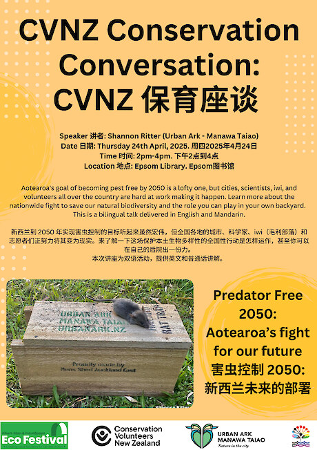 What: Urban Ark works in central Auckland with people who want to make our part of Aotearoa pest free. Come along and find out more about Predator Free 2050 and the groups that are already hard at work in Auckland.