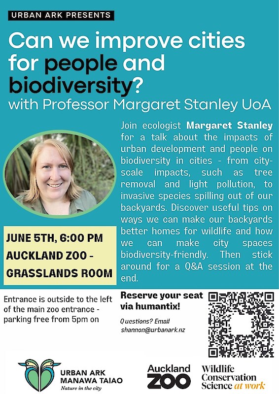 Professor Margaret Stanley from the University of Auckland. She will be talking about the impacts of urban development and people on biodiversity in cities. With an expertise in conservation, invasive species, and urban ecology, we couldn’t imagine a more relevant speaker to share her knowledge about what we can be doing to make our backyards better for wildlife.